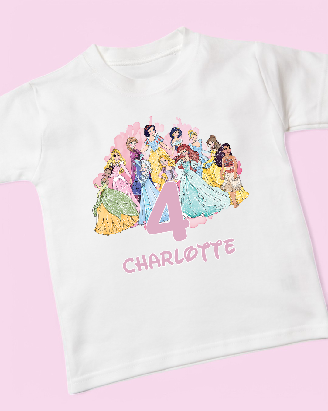 Get ready for fun with our Personalised Princesses birthday cotton T-Shirts! Made of soft cotton, this personalised tee will make your little one stand out.