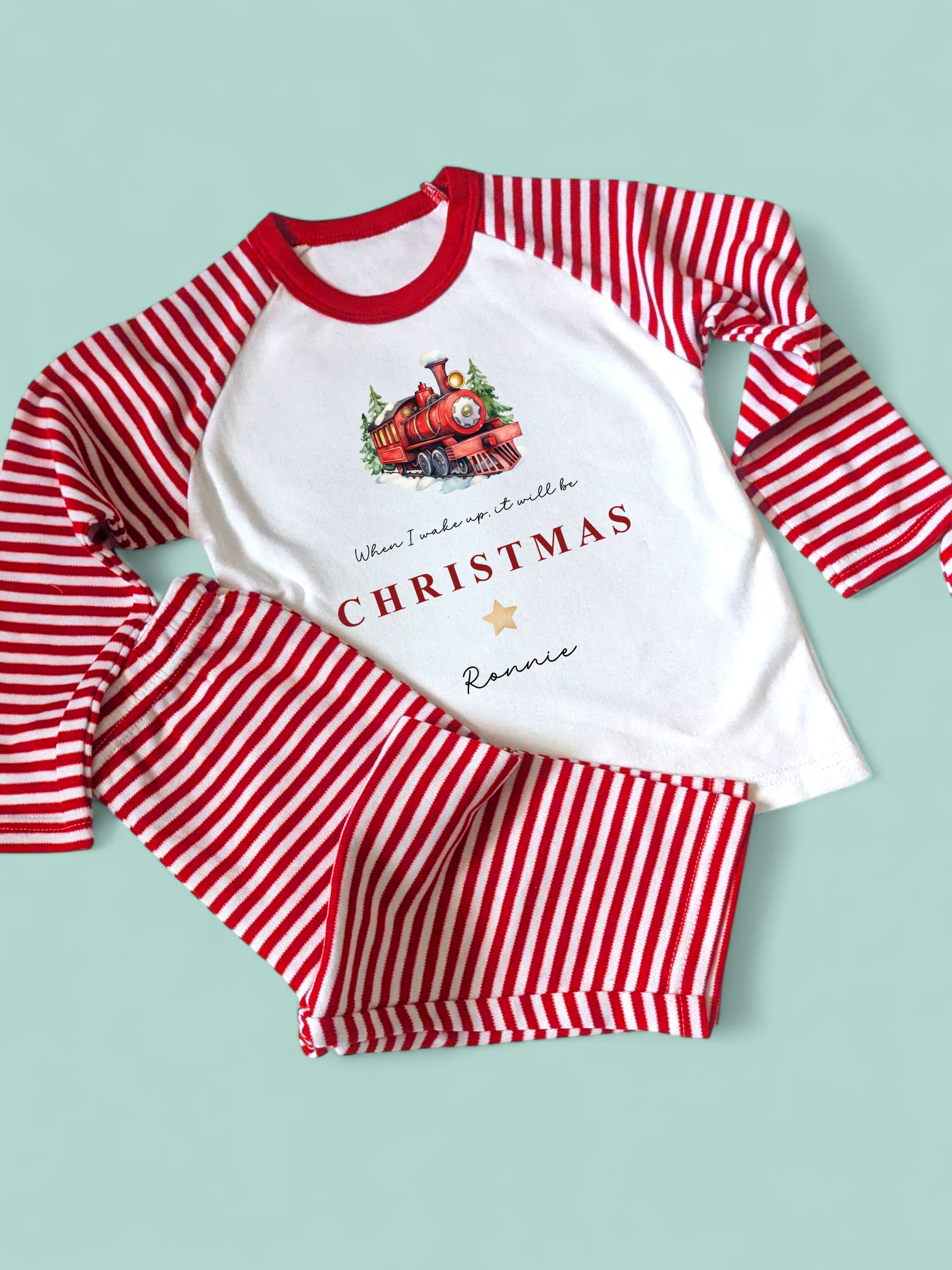 When I Wake Christmas Train Personalised Christmas Red Stripe PJs