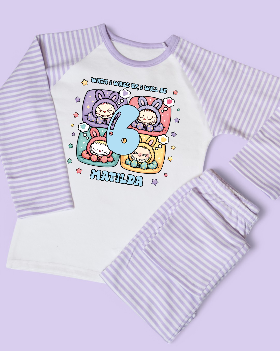 Labubu Birthday PJs, When I Wake Up Labubu Sleeping Birthday Age Personalised Purple Stripe Pyjamas
